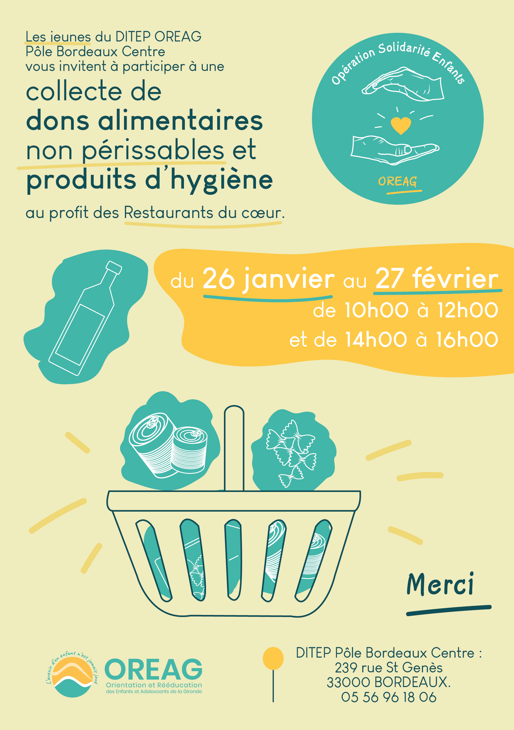 Nous vous invitons à soutenir cette opération en la partageant et/ou en venant déposer vos dons alimentaires non périssables et/ou produits d’hygiène, entre le 26 janvier et le 27 février 2023, au DITEP Pôle Bordeaux Centre :